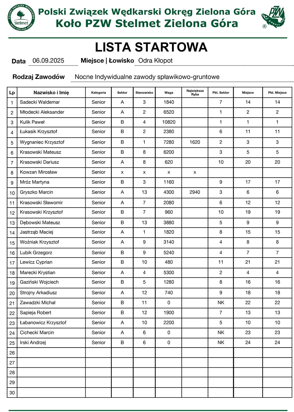 Odra Zawalna - GPO spławik + 2 tura MO seniorów 55+
